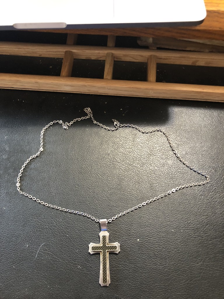 I looked down and saw that the cross I usually wear on the inside of my shirt was hanging there on the outside.