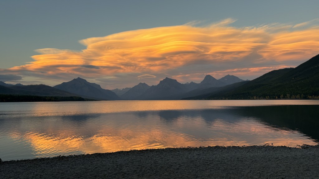 Take Doug and Carl,* for example. We bumped into them last night when we wandered down to the southern shore of Lake McDonald to watch the sunset. Ooooing and Ahhhing over the changing colors of the mountainsides and lenticular clouds overhead, we asked this pair of elderly gentlemen (yes… they were just about exactly our age) if they would take a photo of us against the magnificent backdrop of the Little Matterhorn and the lake.
